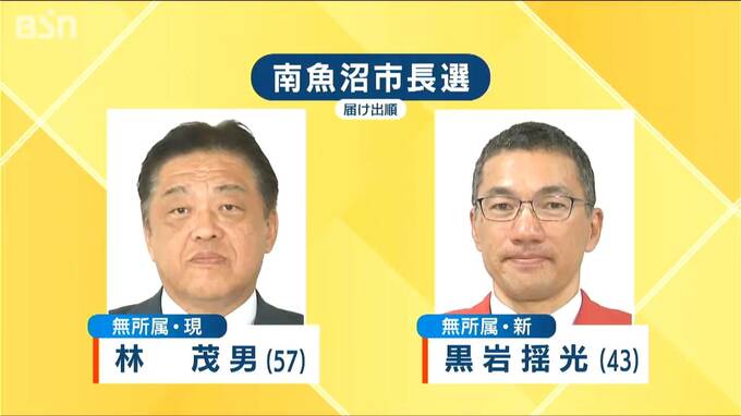 新潟・南魚沼市長選 現職の林茂男氏(57)が3選 新潟放送 2024年11月24日(日) 20:15 国内 任期満了に伴う新潟県南魚沼市長選は24日に投票が行われて即日開票され、現職の林茂男氏(57)が3期目の当選を決めました。 南魚沼市長選には現職の林茂雄氏と新人の黒岩揺光氏(43)の2人が立候補していました。