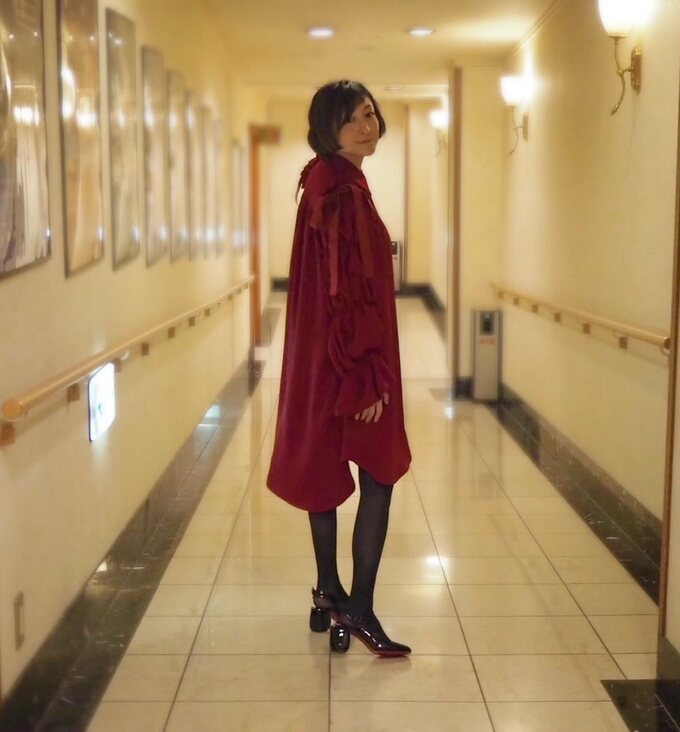 ワインレッドのコーデで撮影された写真を公開しました。