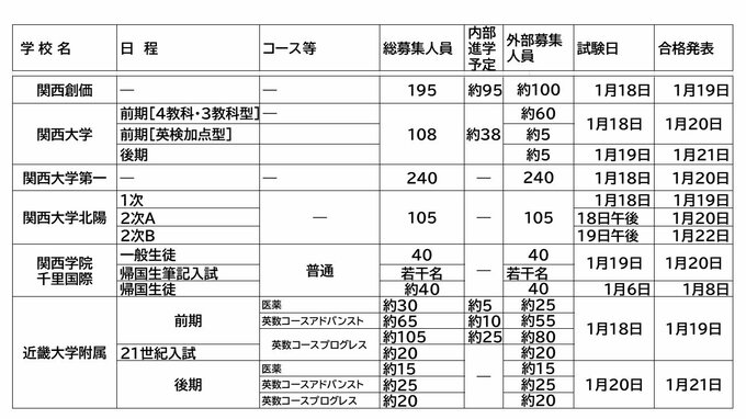 【中学受験2025】大阪・私立中学校入試 大阪星光約190人 四天王寺270人 初芝立命館は「利晶学園大阪立命館」に校名変更して170人 募集人数や試験日程を全校掲載 入試日は1月18日~令和7年度中学入試 毎日放送 2024年11月25日(月) 19:13 国内 【共学校】関大一で240人、近大附属で280人などとなっています。