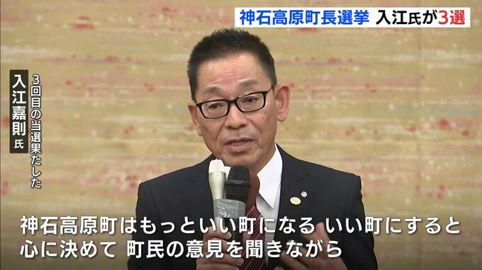 選挙戦で入江氏は、災害に強いまちづくりを進めるため、役場の本庁舎や町立病院の建て替えといったハード整備を進めたことなど、2期8年の実績をアピール。