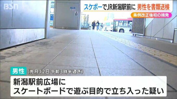 警察によりますと、男性は10月12日午前3時半過ぎに、新潟市中央区花園の新潟駅前広場に、スケートボードで遊ぶ目的で立ち入った疑いが持たれています。