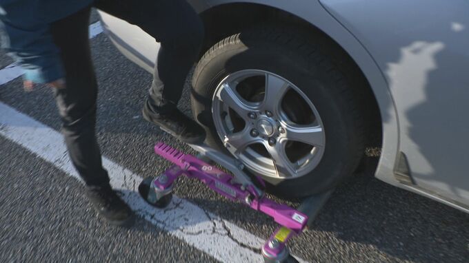 訓練では、大雪による長時間の立ち往生でドライバーが避難した際、残された車を道路わきへと動かす訓練も行われ、タイヤを専用のジャッキで持ち上げたあと、人の力で車を押し移動させました。