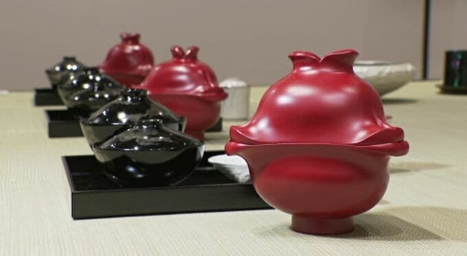 漆作家・五月女晴佳さんの煮物椀は唇がデザインされていて、和をイメージし普段より朱の色味を強く出しているということです。