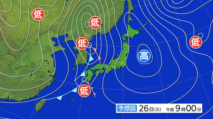 26日午前9時の予想天気図ですが、日本海と九州の南西沖に低気圧があり、東へと進む見込みです。