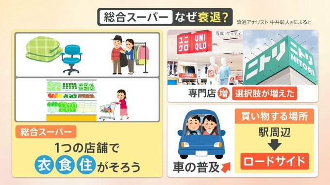 流通アナリストの中井彰人氏は、「週末の買い物が衣・食・住から、時間消費型の楽しみ方が増えた衣・食・住・遊に変化」としていて、「遊」の部分もとなると、「総合スーパーだけでは…」と変化しているようです。