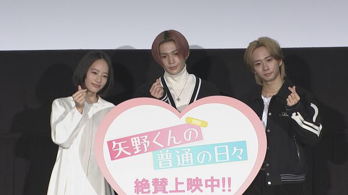 FANTASTICS・八木勇征さん主演映画『矢野くんの普通の日々』の大ヒット御礼舞台挨拶が行われ、八木さんのほか、池端杏慈さん、Travis Japan・中村海人さんが登壇しました。