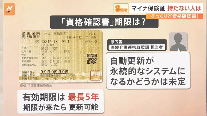 資格確認書の期限は、最長で5年、期限が来たら更新可能ですが、厚労省 医療介護連携政策課の担当者は「自動更新が永続的なシステムになるかどうかはまだ未定」と話しています。