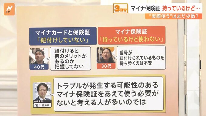 マイナンバーカードに詳しい中央大学の宮下紘教授によると、「トラブルが発生する可能性のあるマイナ保険証をあえて使う必要がないと考える人が多いのではないか」ということです。