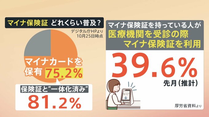 マイナ保険証を持っている人が医療機関を受診の際、実際に利用しているという人は10月時点の推計で、39.6%だということです。(厚労省資料より)