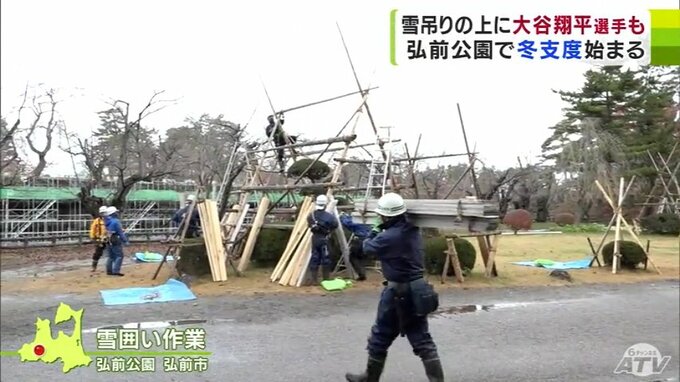 雪から樹木を守るのは「大谷翔平選手」に「デコピン」!? 弘前公園で冬支度はじまる 雪吊りの「頭飾り」は2024年も個性的! 青森テレビ 2024年11月26日(火) 06:00 国内 11月11日まで「弘前城菊と紅葉まつり」が開かれていた弘前公園で、冬支度が始まりました。 枝を雪の重さから守る雪吊りでは、2024年の世相を反映し「大谷翔平選手」にちなんだ頭飾りが施されています。