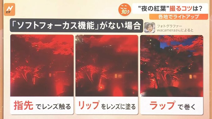 「ソフトフォーカス機能」がない場合、▼指先でレンズを触る、▼「リップ」をレンズに塗る、▼ラップを巻くと幻想的な写真が撮れるそうです。また、「ソフトフォーカス」アプリもあるということです。