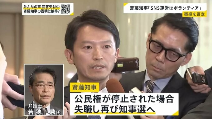 弁護士の若狭氏によると、仮に斎藤知事の公民権が停止された場合、失職し、再び知事選が行われるといいます。斎藤知事は…