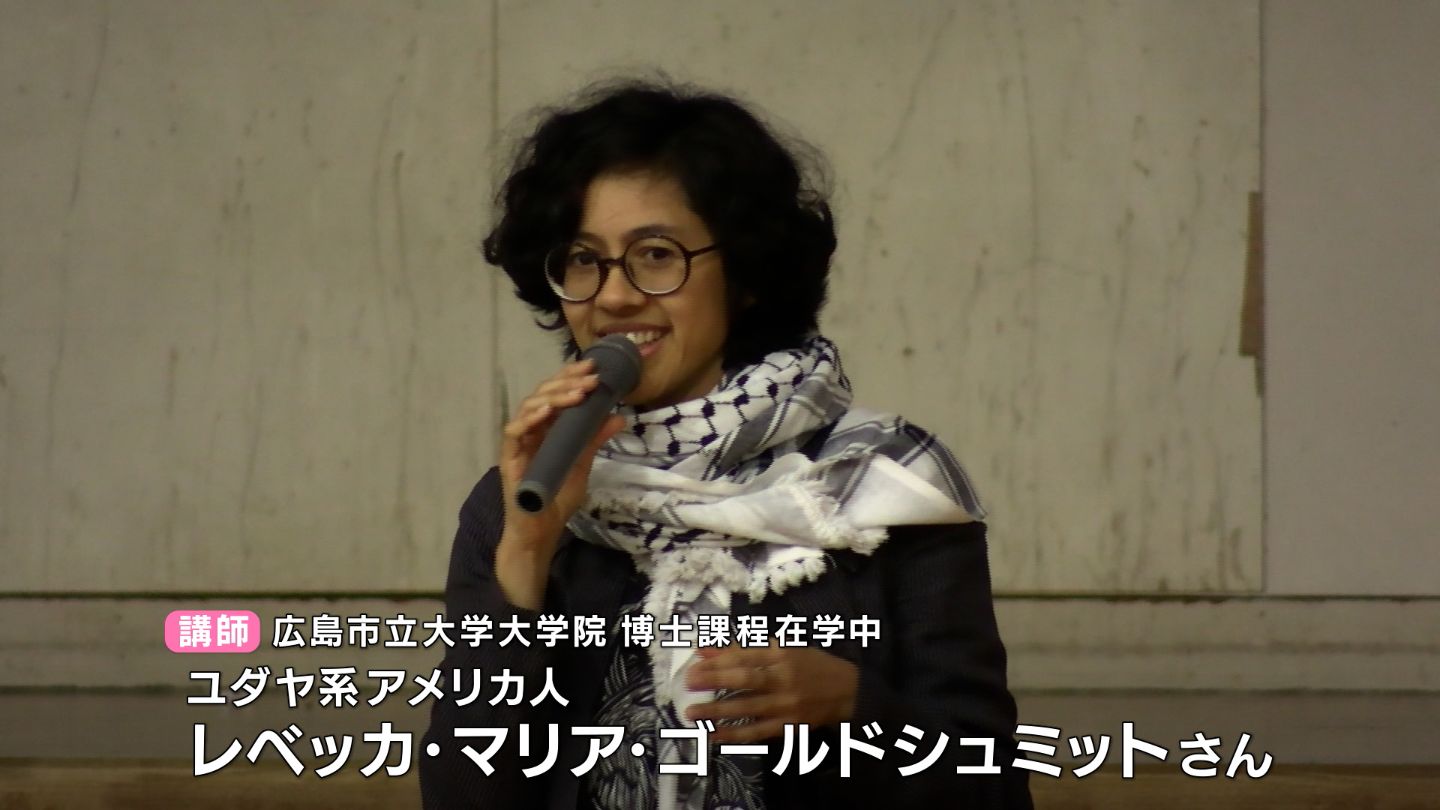 イスラエル生まれの父親を持つレベッカさん。自らのルーツであるイスラエルが罪なき人々の命を奪っている現実に心を痛めガザで戦闘が本格化した昨年10月以降、広島の原爆ドーム前で抗議活動を続けてきました。講演会では、生徒たちに写真を使い現地の惨状を伝えた上で、反戦を訴えました。