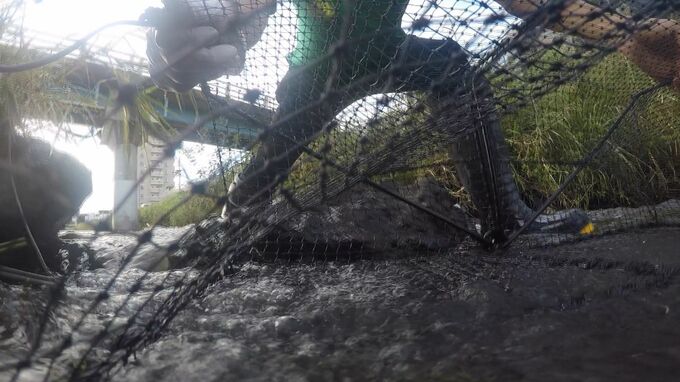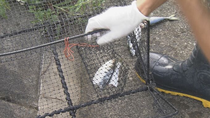 「アカミミガメを捕まえるためのわなの準備をしていて、(かごの中に)エサになる生魚を入れて準備しています」