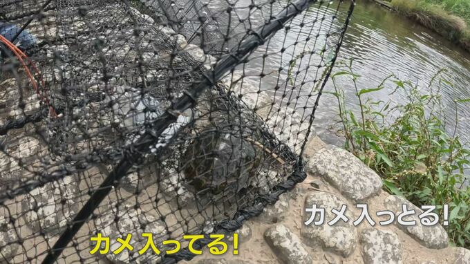 かかったのは、アカミミガメではなく、在来種のニホンイシガメ。そして、特定外来生物のウシガエルも。その後、ウシガエルは、駆除となりました。