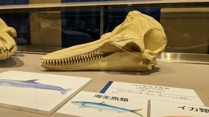 また、シャチは海中最強の捕食者で小魚から大型クジラまで襲いますが、口には大きく鋭い歯が上下に並び、大きな肉を食いちぎる力強い構造になっています。一方、ハンドウイルカは細い歯がびっしりと生え、小魚やイカを確実に捕らえて丸呑みできるようになっています。