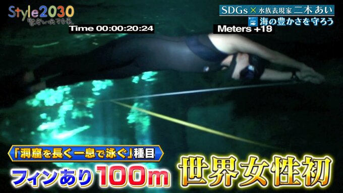 水族表現家として活動を続ける中で、二木氏は2011年、ギネス記録に挑戦。洞窟を長く一息で泳ぐ種目で、フィンをつけて100mという女性初の記録、フィンなしで90mという世界初の記録、二つの世界記録を樹立した。