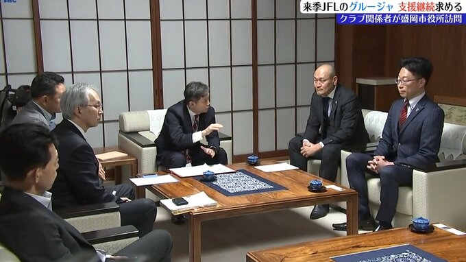 今シーズンが終了し、来シーズンはJFLで戦うことが決まっているいわてグルージャ盛岡の関係者が盛岡市役所を訪れ、内館茂市長に支援の継続を求めました。26日はクラブの運営会社いわてアスリートクラブの秋田豊前…