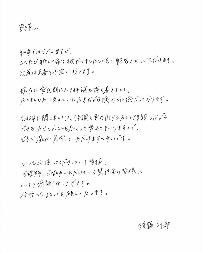 須藤さんは、直筆のメッセージを寄せ「このたび新しい命を授かりましたことをご報告させていただきます。」「出産は来春と予定しております。」と知らせました。