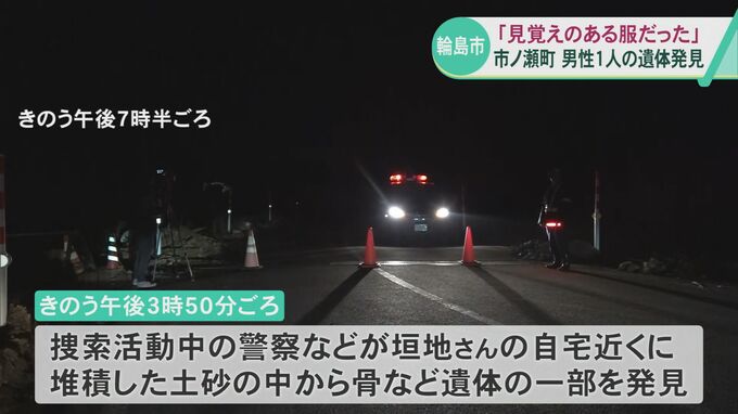警察によりますと25日午後3時50分ごろ、捜索活動にあたっていた警察と建設会社の作業員が、垣地さんの自宅近くに堆積した土砂の中から骨など遺体の一部を発見し、およそ5時間半後に男性1人の遺体を引き上げました。