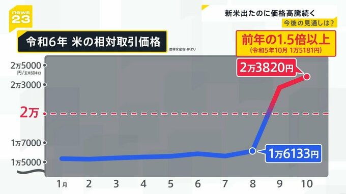 ところが、新米が出荷された後も価格は高騰したままです。農水省が発表した10月の新米の取引価格は、前の年と比べて1.5倍以上で推移しています。