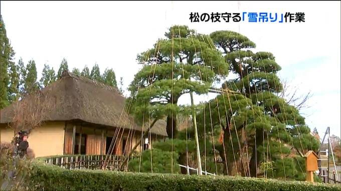 本格的な冬の訪れを前に雪の重みから松の枝を守る雪吊りの作業が宮城県川崎町の公園で行われています。川崎町のみちのく杜の湖畔公園には、樹齢600年といわれる高さ6.5メートルの松があり、毎年、雪の重みから枝を…