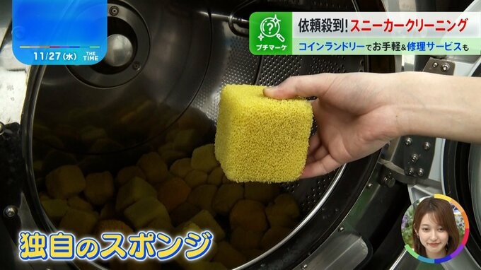 専用の洗濯機に、靴と一緒に“靴を傷つけない独自のスポンジ”を大量に入れて丸洗い!強力洗浄してくれます。