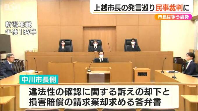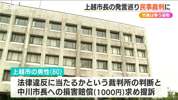 この発言を受け、上越市に住む80歳の男性が法律違反にあたるか裁判所の判断を仰ぐことと、中川市長に対し1000円の損害賠償を求めて新潟地裁に提訴。