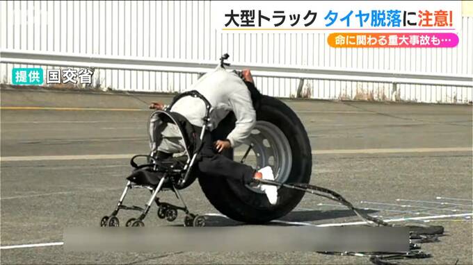 タイヤ交換の際に、確実な作業と点検を怠るとタイヤが脱落し、死亡事故につながります。時速60kmで走行中のトラックからタイヤが脱落したという想定で行われた国交省の実験映像では、ベビーカーを押している男性に…
