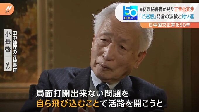 今月29日で、日本と中国が国交を正常化してからちょうど50年を迎えます。JNNでは「日中50」と題して、この50年間と未来を数回にわたって検証します。初回は、当時の田中角栄総理の元総理秘書官が振り返る、国交正常化交渉です。