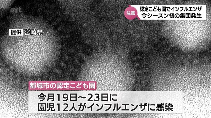 宮崎県都城市の認定こども園でインフルエンザが集団発生しました。県内では、今シーズン初めての集団発生です。県によりますと、都城市の認定こども園で、今月19日から23日にかけて園児12人がインフルエンザに感染…