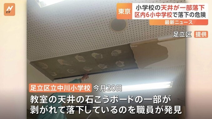 東京・足立区の小学校で今月20日、教室の天井の一部が剥がれて落下しました。その後の点検で、区内にある6つの小中学校で天井の落下のおそれがあることがわかりました。足立区によりますと、今月20日、区立中川小…