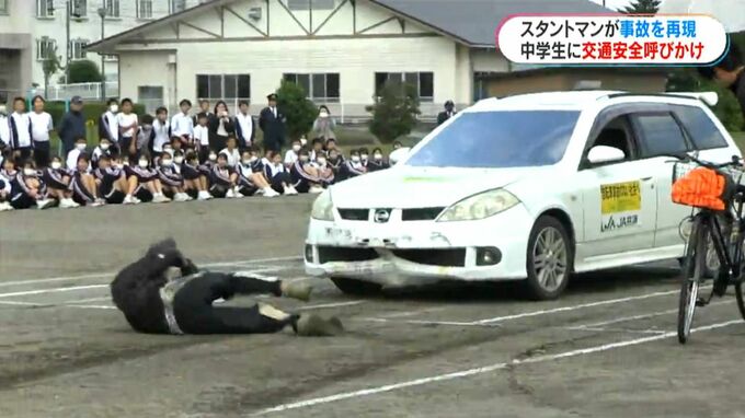 自転車の交通事故をスタントマンが再現し、事故防止を呼びかける交通安全教室が鹿児島県肝付町の中学校で開かれました。この交通安全教室は県警が協力し、JA共済連鹿児島などが肝付町の高山中学校で行ったものです…