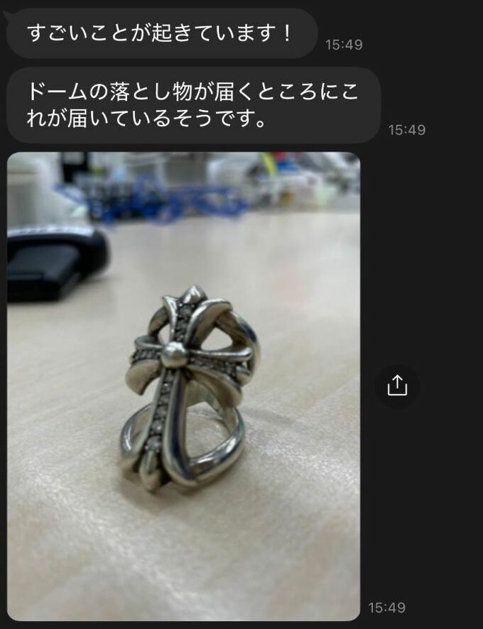 さらに続く投稿では「まじ!!!!」「奇跡!!!!」とビックリマークを連発させて「当日のドームアルバイトさんが拾い届けてくれたそうです」「その人が誰なのか探しています」と、スマホに送られたチャットのスクリーンショットとともに報告。そこにはたしかに、ELLYさんが着けていた指輪が写っています。