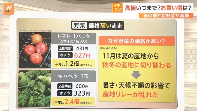 なぜこんなに野菜が高いのでしょうか。農水省によると、11月というのは夏の産地から秋冬の産地に切り替わってくる時期。しかし、暑さや天候不順の影響で産地リレーが乱れてしまい、少し空白の期間ができてしまったということなんです。
