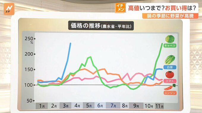農水省のグラフがあるので見ていきましょう。野菜が今どれぐらい高いのかを1年トータルで表しています。キャベツは今高いですよね。春先にも春キャベツが一気に上がったというニュースをNスタでも取り上げました。
