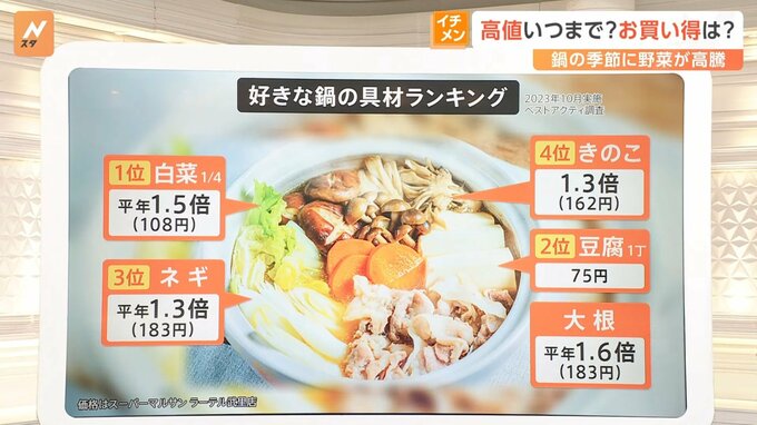 そうですよね。人気ランキングというものがあって、1位に白菜、2位に豆腐が入っています。1位の白菜も平年に比べると1.5倍。4分の1で108円と考えるとやはり少し高いなと。3位のネギも183円で平年の1.3倍。しめじなどのきのこ類も、やはり高くなっています。