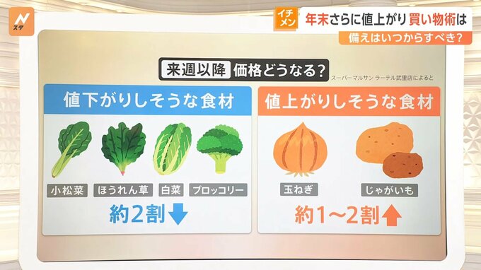 高いだけではなくて、来週以降の野菜の価格について良いニュースもお伝えします。値下がりしそうな食材をスーパーマルサンの店長に聞くと、小松菜、ほうれん草、白菜。ブロッコリーも高いという印象がありますが、少し下がってくるだろうということです。