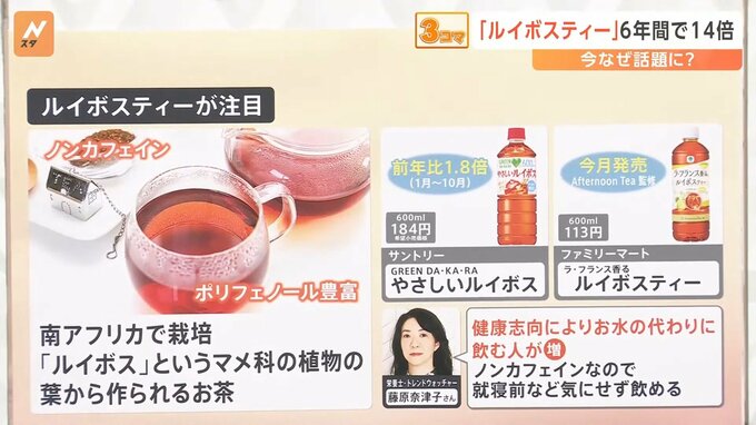 栄養士・トレンドウォッチャーの藤原奈津子さんによると「健康志向により、お水の代わりにルイボスティーを飲む人が増えている。ノンカフェインなので就寝前など気にせず飲める」ということで、“健康面”がキーワードになってきているということでした。