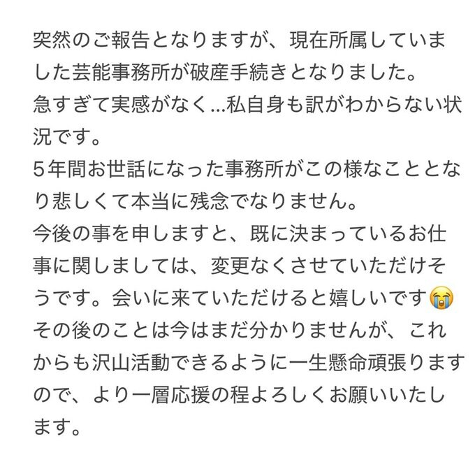 「突然のご報告となりますが、現在所属していました芸能事務所が破産手続きとなりました。急すぎて実感がなく...私自身も訳がわからない状況です」と、内木さん自身が混乱している状況を伝え、「5年間お世話になった事務所がこの様なこととなり悲しくて本当に残念でなりません」と苦しい胸の内を告白しました。