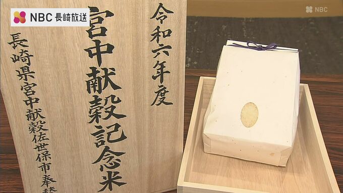 今月23日に執り行われた新嘗祭で天皇陛下に献上された米を育てた佐世保市の生産者が28日、知事に米を贈呈しました。こちらが佐世保の生産者が秋の新嘗祭で献上した宮中献穀記念米です。28日、県庁では6月から米を…