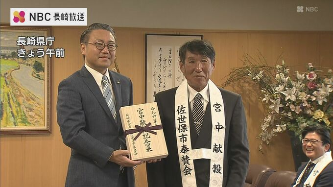 こちらが佐世保の生産者が秋の新嘗祭で献上した宮中献穀記念米です。28日、県庁では6月から米を育てた佐世保市上柚木町の松永昌志さんから大石知事に宮中献穀記念米が贈呈されました。