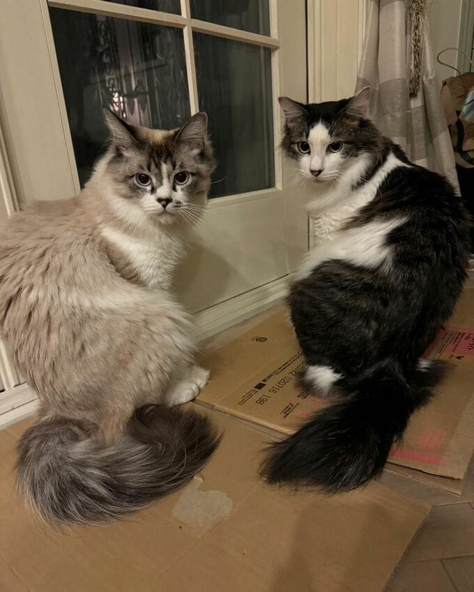 4枚目の写真では「うすら」「まだら」が左右対称のポーズでこちらを振り返りつつ「なにするんだ」というような表情で見つめていて、まさに「#猫すきあるある」な日常の一コマとなっています。