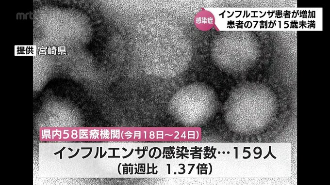 宮崎県内のインフルエンザの患者数は、前の週の1.37倍に増えました。患者のうち7割が15歳未満となっています。今月24日までの1週間に、県内58の医療機関で確認されたインフルエンザの感染者数は159人で、前の週の1.…