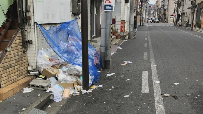 カラスに荒らされ、生ごみが散乱する集積所。飲食店のものと思われる、大量の調味料のボトルが家庭ごみとして捨てられています。