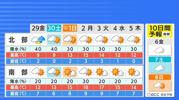 この先土曜日頃まで冬型の気圧配置が続き、その後一旦緩みますが来週の後半には再び冬型の気圧配置になる予想です。寒気の影響ですっきり晴れる日は少なく雲が広がりやすいでしょう。北部を中心にしぐれる日が多いでしょう。本格的な冬の寒さがやってきますので、防寒対策をしっかりとしてください。