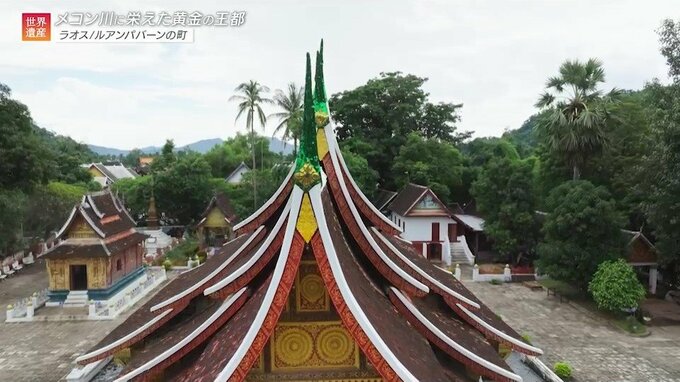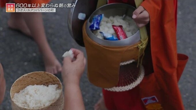 街にはルアンパバーン様式といわれるオレンジ色の三角屋根をいくつも重ねたような寺院が点在し、世界遺産エリアだけでも34もあります。こうした寺院から、毎朝5時すぎになるとオレンジ色の袈裟を着たお坊さんたちがぞろぞろと現れ、夜明けの街を列をつくって歩いて行きます。お寺ごとに歩くルートが違い、その道沿いに街の人々が座って待っていて、餅米やお菓子などをお坊さんたちに渡していくのです。