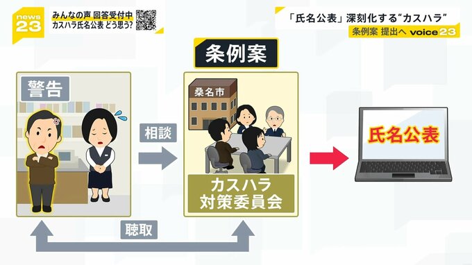 条例案では、カスハラを受けた店などが市に相談。有識者らでつくる対策委員会が、カスハラを行った人に聞き取りなどの調査を行います。その後、悪質なカスハラに該当すると判断されれば、警告を行い、それでも改善が見られない場合には、ホームページなどで名前を公表するとしています。