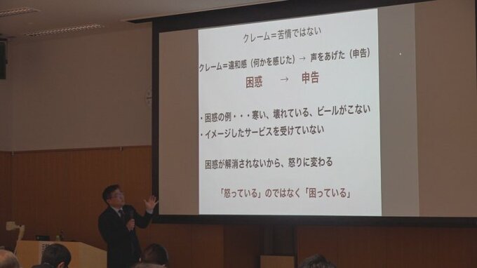今年行われた調査では、小売業の34.1%、サービス業の20.2%がカスハラ被害を訴えていて、旅行会社などで顧客対応の経験を持つ講師は、「カスハラに至る前にクレームは苦情ではなく客の困惑と捉え、共感や提案の姿勢を示すことが大切とした上で、金銭の要求など悪質なケースでは第三者を交えた対応が必要」と述べました。