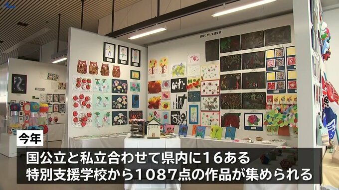 会場にはユニークな作品の数々が並んでいます。盛岡市のアイーナで始まった県特別支援学校作品展は、1981年から続く伝統ある展示会で、今年は国公立と私立合わせて県内に16ある特別支援学校から1087点の作品が集められました。